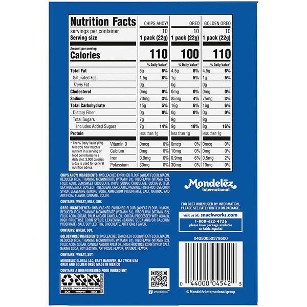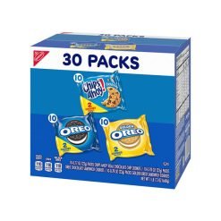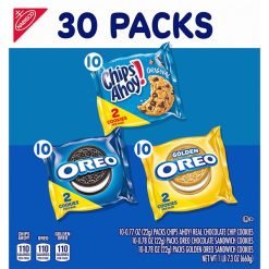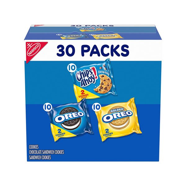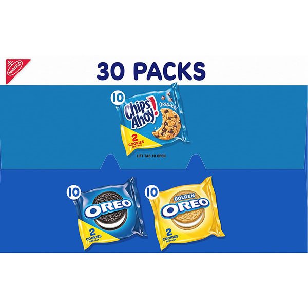 • One Nabisco Sweet Treats Cookie Variety Pack with 30 two-cookie snack packs, including 10 each of OREO Original, OREO Golden and CHIPS AHOY (packaging may vary)