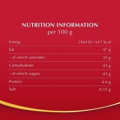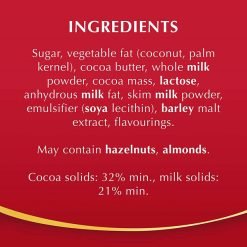 Sugar, Vegetable Fats (Coconut, Palm Kernel), Cocoa Butter, Cocoa Mass, Whole MILK Powder, Skimmed MILK Powder, LACTOSE, Anhydrous MILK Fat, Emulsifier (SOYA Lecithin)BARLEY Malt Extract, Flavourings, Vanilla, MILK Chocolate contains – Cocoa solids: 31% minimum, MILK solids: 20% minimum. May contain hazelnuts, almonds and other nuts.