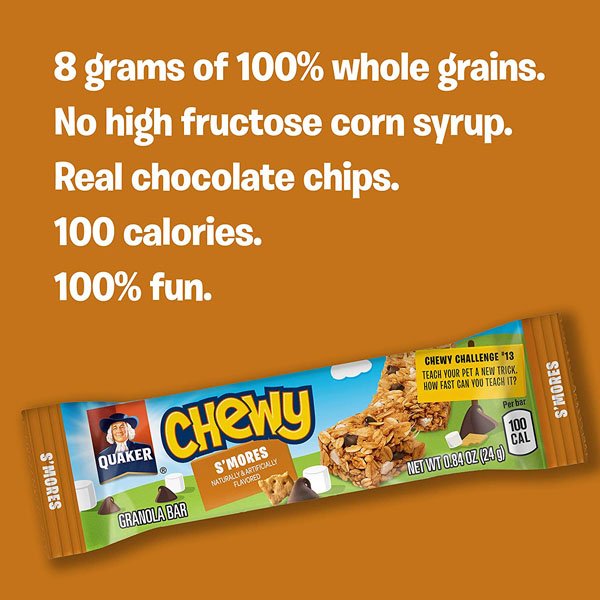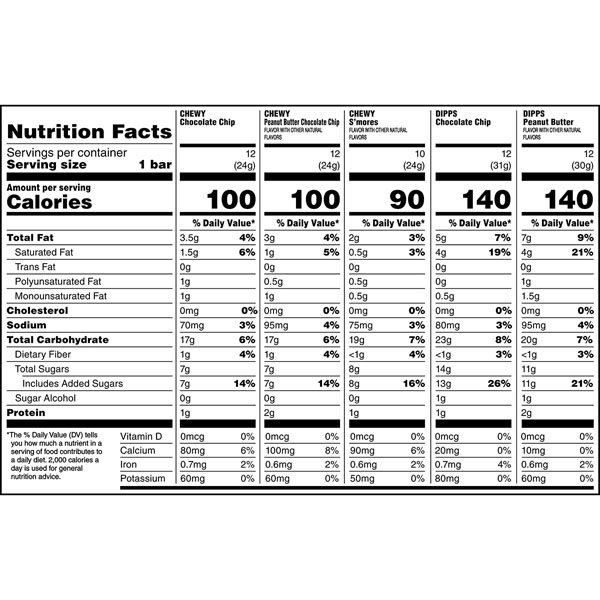 - Features 12 chocolate chip, 12 peanut butter chocolate chip, and 10 s’mores flavor Chewy granola bars, plus 12 chocolate chip and 12 peanut butter flavor Chewy Dipps chocolate covered granola bars