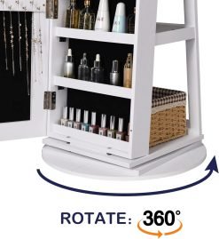 Elevate your daily routine with the Revolving Jewelry Cabinet – a versatile and functional addition to your living space. This elegant piece seamlessly combines the practicality of a mirror, a jewelry organizer, and a storage shelf, creating a perfect synergy of style and utility.